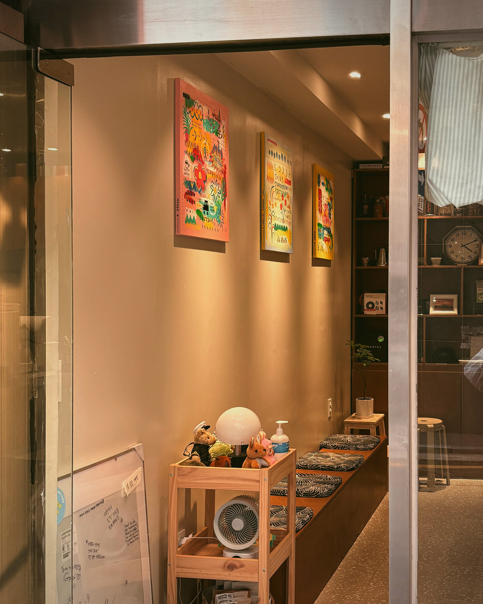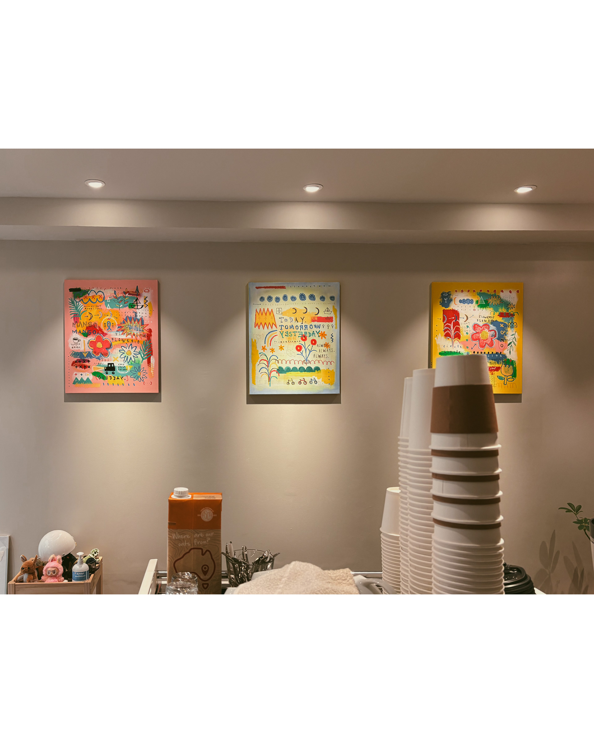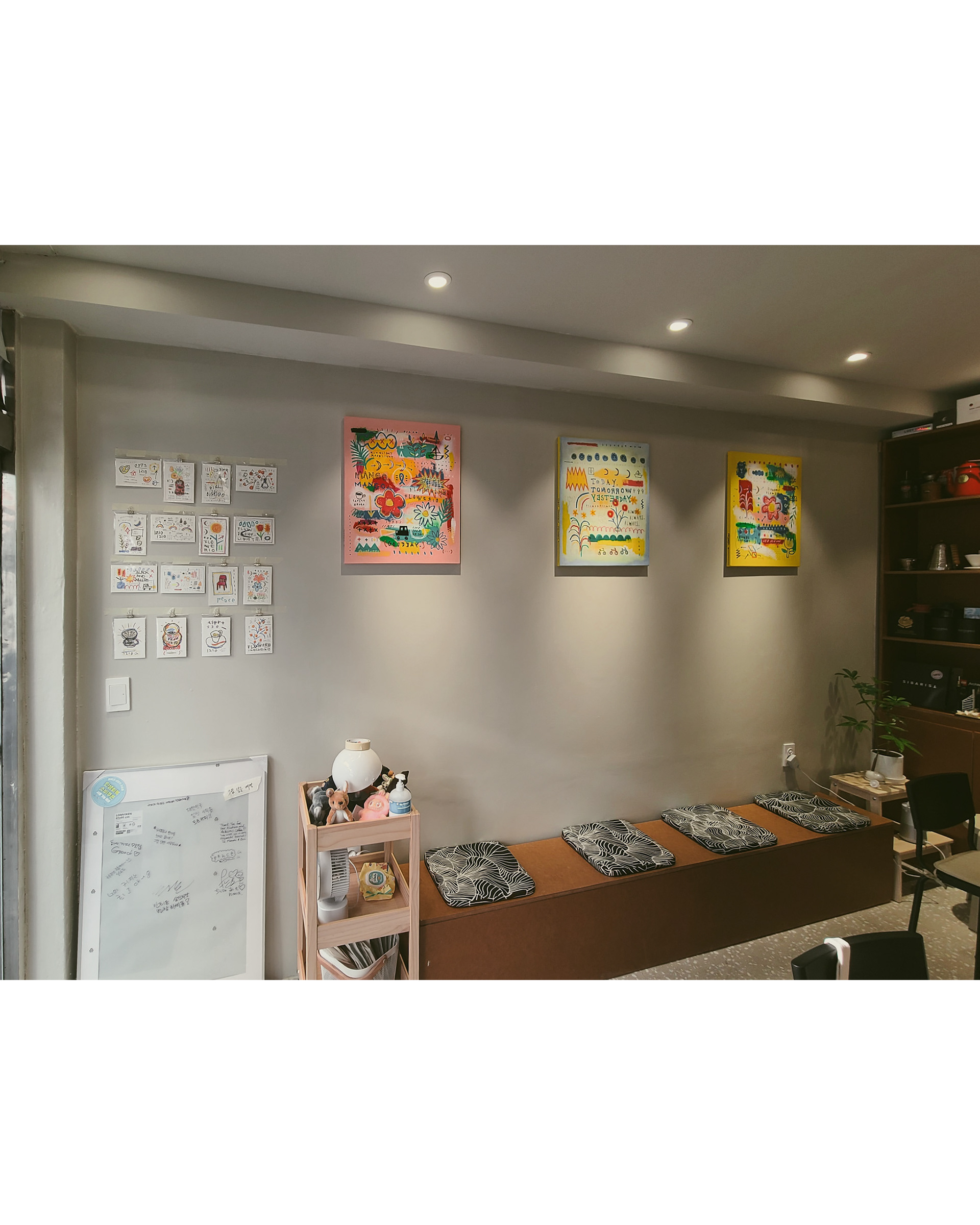 이 친구는 호주에서 잠시 지내는 동안 ‘생활 속에서 스며드는 예술이 늘 가장 따뜻하다’고 생각했다고 합니다. 그리고 한국으로 돌아와 카페를 열면서 한쪽 벽에는 제 그림을 꼭 걸어야겠다고 생각하고 비워두었다고 합니다. 추석 전부터 그림에 대해 이야기 나누었는데, 이제야 걸었습니다. 생각해 주고 기다려줘서 고마울 따름입니다.